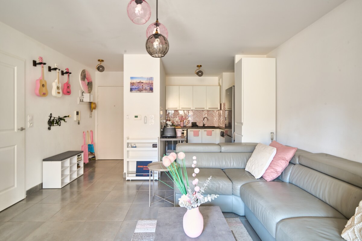 en el séptimo piso con ascensor, el apartamento fue completamente renovado en 2021 por un arquitecto. Gran sala de estar bañada por el sol, y cocina abierta frente al mar. Estas dos habitaciones tienen acceso directo a la terraza Un gran pasillo conduce a la zona de noche, donde se encuentran las dos habitaciones con aire acondicionado. Excelente ubicación: - 2 min de la playa de los catalanes - 3 minutos del Palacio del Faro - a 10 minutos del Puerto Viejo Número de registro: 13207015531DP
