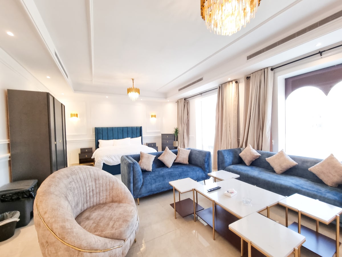 Welcome to our cozy private studio, designed for your comfort. 🚪Enjoy the convenience of Self Check-in with a smart keypad. Enjoy 5G wifi and a 75-inch TV with Netflix, Shahid, and YouTube Premium The bathroom is stocked with essentials like towels, soap, shampoo, and body wash for your convenience. Just a minute away, you'll find everything you need such as a mini-market, laundry service, barber shop, and restaurant