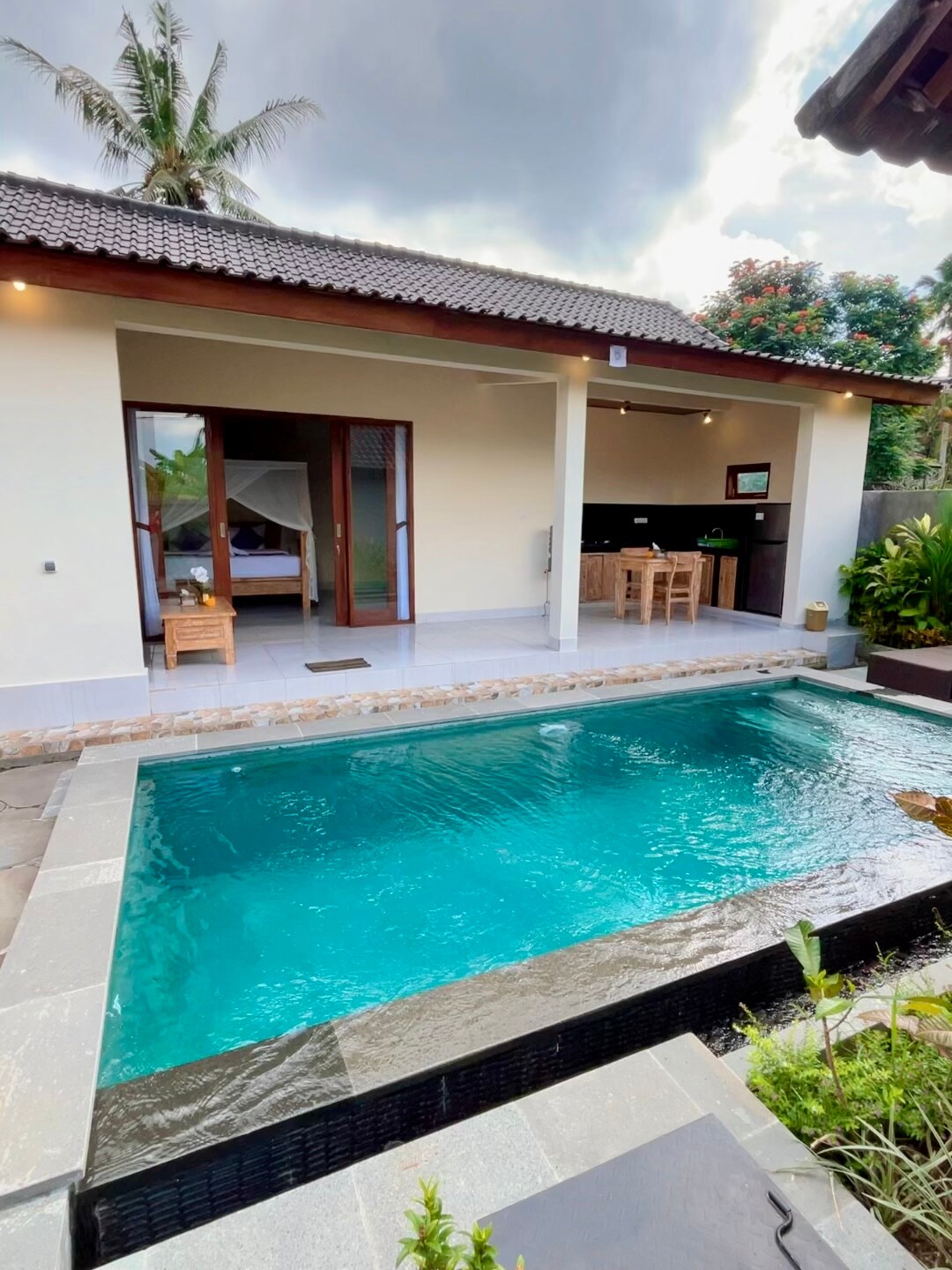 Lujosa villa privada con piscina de 6x3 metros. Segura, privada, protegida. Exuberante jardín y cocina protegida pero al aire libre para comer y relajarse junto a la piscina. Cama tamaño queen, bañera y ducha exteriores, con vistas al estanque de peces, cocina totalmente equipada. Aire acondicionado, televisión, excelente wifi, limpieza diaria y desayuno incluido. Estamos a 8 minutos a pie de la carretera principal o a un corto trayecto en scooter. Esto significa paz y tranquilidad, y sin ruido de coches. Nuestro personal estará encantado de llevarte en scooter si es necesario.