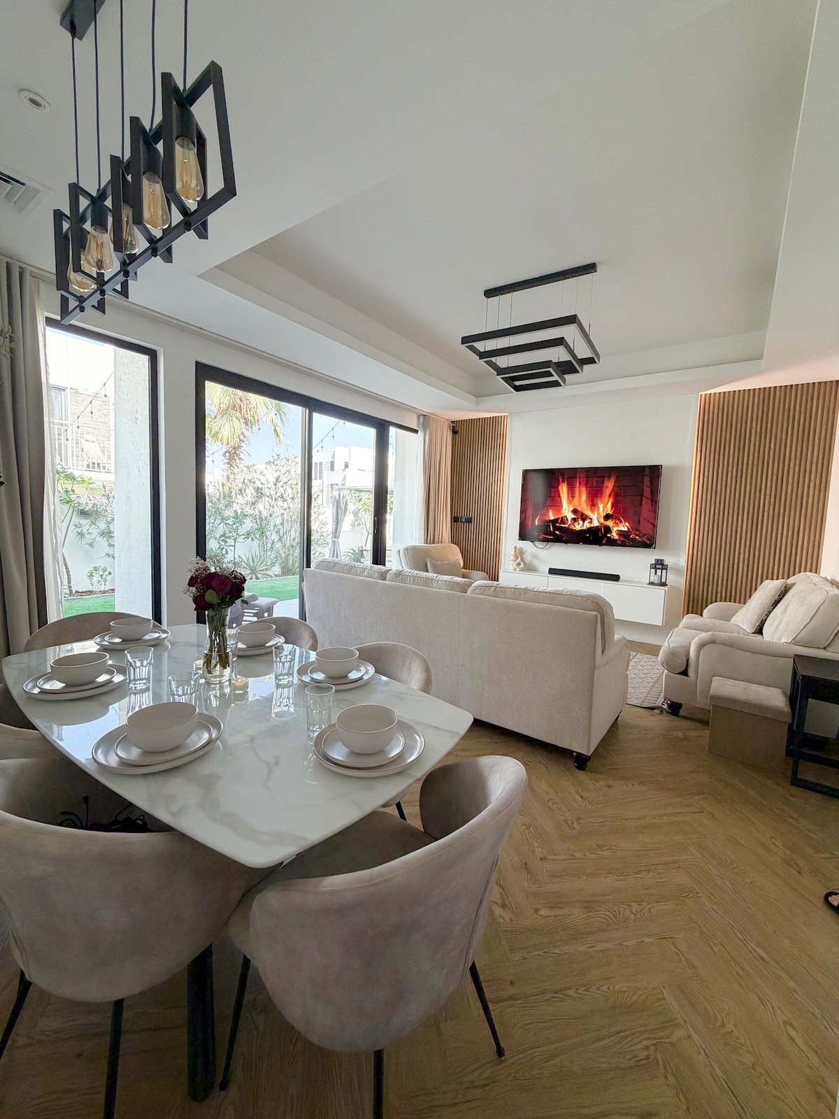Villa moderna con 5 Master Room, Amplia sala de estar, terraza, piscina privada, dos salones al aire libre, barbacoa. Terminal eléctrico para Tesla. Todo en una comunidad agradable. Zona de juegos para niños, supermercado, restaurante, farmacia , máquina expendedora. 5 minutos de img A 10 minutos de la aldea global 15 minutos del centro de la ciudad. 25 JBR Dubai Marina 30 minutos del aeropuerto Una señora de la limpieza está a su disposición durante su estancia.