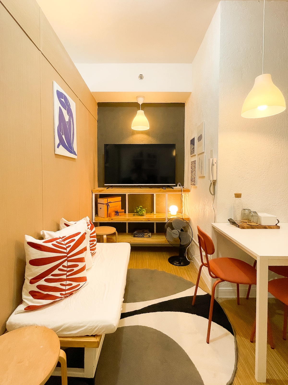 Diseño de interiores estético. ✅Increíble vista de los servicios y la ciudad. A ✅15 minutos de BGC, a poca distancia de tiendas de comestibles, centros comerciales, hospital. Fácil acceso a✅ agarre/motocicleta. ✅Casa club con restaurante y bar. Tienda ✅conveniente y lavandería en el vestíbulo. ✅Agua mineral gratuita ✅Buena conexión a internet ✅Proyector en el dormitorio principal Puerta ✅de alta tecnología con cerradura con llave ✅Servicio de conserjería Televisor de✅ 65 pulgadas con Netflix. ✅ Estacionamiento de pago disponible previa reservación al menos 2 días antes de que sea necesario
