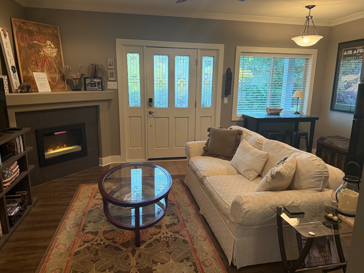 Casa de campo privada en un entorno rural cerca de la ciudad. Un dormitorio con baño privado y sala de estar separada. Chimenea eléctrica para calor y ambiente. Microondas y cafetera con café, té y aperitivos incluidos. Mesa de comedor estilo bistró con vistas a las montañas Cascade y Three Sisters. Porche delantero cubierto con vistas al patio de espacio abierto. Patio de jardín privado adyacente con vistas a las montañas Three Sisters, perfecto para tomar un café por la mañana o una copa de tu bebida favorita por la noche.