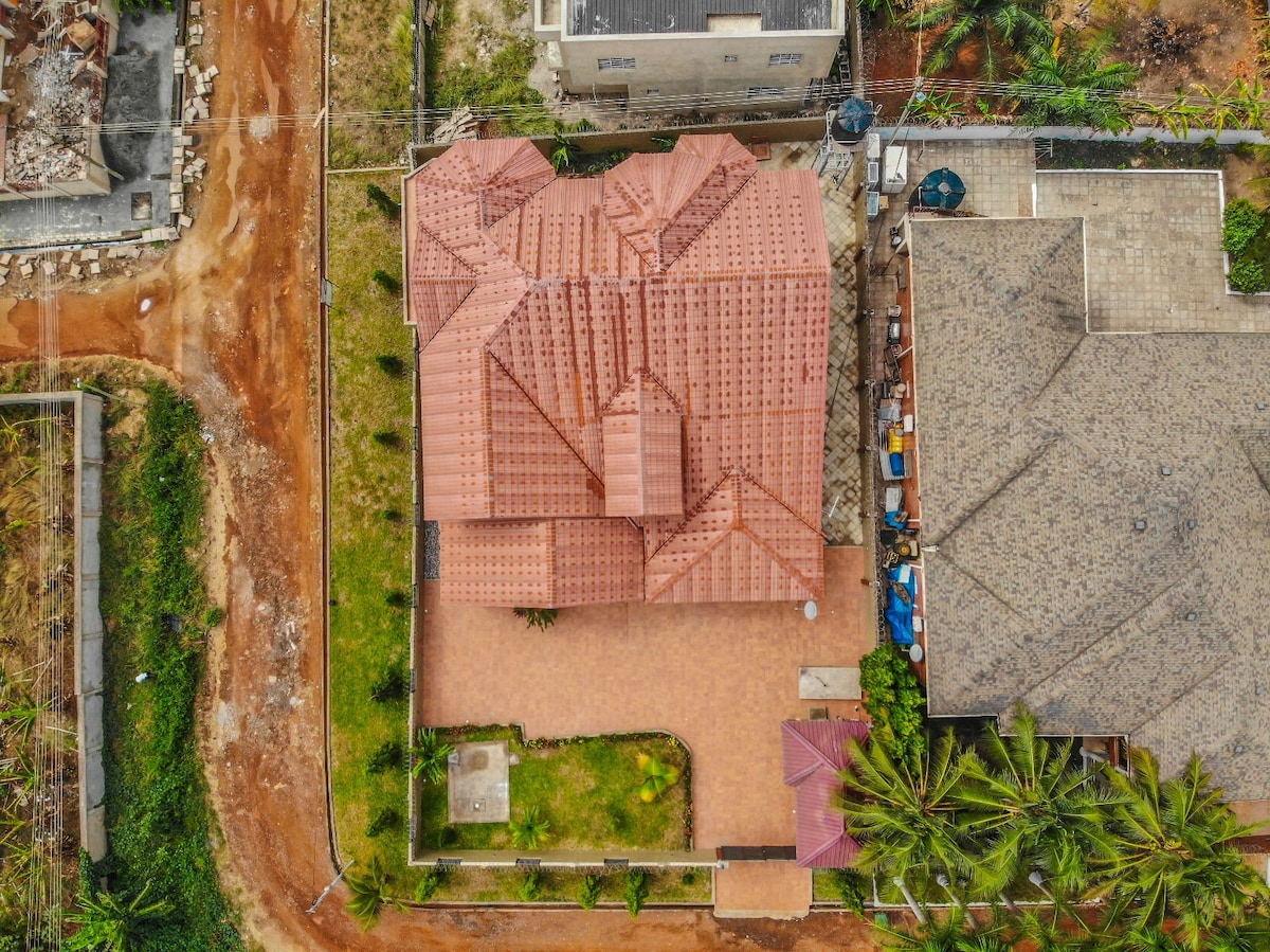 Relájate en este espacio tranquilo y elegante. Un lugar acogedor con un amplio aparcamiento a tu disposición. seguridad las 24 horas está asegurada porque tu seguridad es importante para nosotros. Céspedes y árboles de sombra CUIDADOSAMENTE RECORTADOS más lugares para explorar como los jardines botánicos aburi, las cascadas de los boti, el arte aburi y los centros artesanales. más cerca del centro comercial Accra Mall, el aeropuerto y muchos restaurantes. siempre puedes pasar un buen rato en este lugar sereno y sentirte como en casa. sam Dam aloja una experiencia en casa lejos de casa.