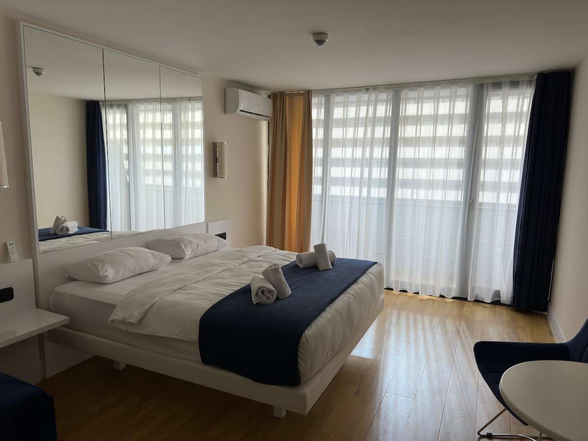 Wake up to a stunning sea view and enjoy your morning coffee on a cozy balcony overlooking Batumi 🌊 This modern and comfortable studio is located in Orbi, just a 2-minute walk from the beach. Perfect for couples, solo travelers, or remote workers looking for a relaxing stay. ✔ High floor with beautiful sea view ✔ Balcony with seating area ✔ Fast WiFi & Smart TV ✔ Comfortable bed with hotel-quality linens ✔ Fully equipped kitchenette ✔ Self check-in for easy arrival