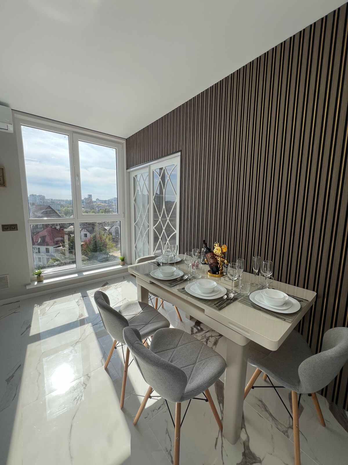 Welcome to GrandStay Apartments, the pinnacle of luxury in Chișinău’s ultracentral heart. This high-end apartment offers floor-to-ceiling glass walls with panoramic views of Cathedral Park, three private balconies, and designer furnishings. Enjoy a premium king-size bed, a stunning in-bedroom bathtub overlooking the park, and a stylish bathroom. A private gym with a city-view terrace and a dedicated concierge complete this exclusive experience.