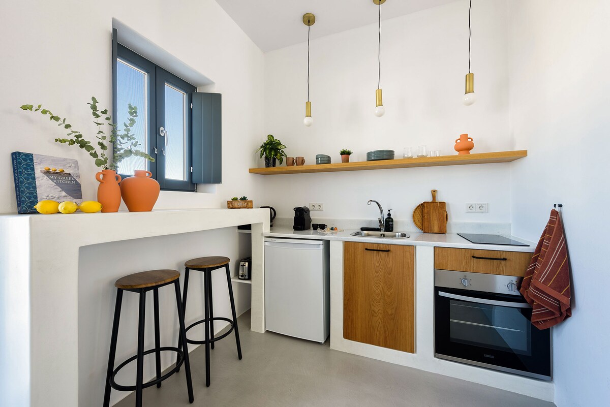 Este apartamento independiente de 24 metros cuadrados forma parte de San Constantino Boutique Villa, una villa boutique tradicional de tres apartamentos, situada en el centro de Fira, en una de las zonas más seguras de la isla, con espacio abierto y espectaculares vistas al mar. El apartamento consta de una habitación individual con cama tamaño king, baño con ducha, fregadero de cocina, cafetera Nespresso, microondas, hervidor de agua, secador de pelo, toallas, albornoces, zapatillas y un jacuzzi climatizado al aire libre privado con increíbles vistas al amanecer.