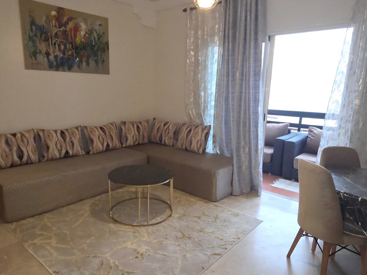 Appartement standing à Marina Agadir meublé avec goût, entièrement équipé. -1 CHAMBRE PARENTS+ DRESSING + SALLE de BAIN (baignoire) +loggia. - 1 CHAMBRE d’AMIS +Salle de Bain (douche) - 1 SALON 2 CANAPÉS + TV +wifi gratuit+ balcon - 1 SALLE à MANGER, 6 chaises (idéale pour télétravail) - 1 CUISINE ÉQUIPÉE La Résidence est située en front de mer, entourée de jardins luxuriants; de magnifiques piscines; à proximité de la plage; corniche; port de loisirs; boutiques...etc