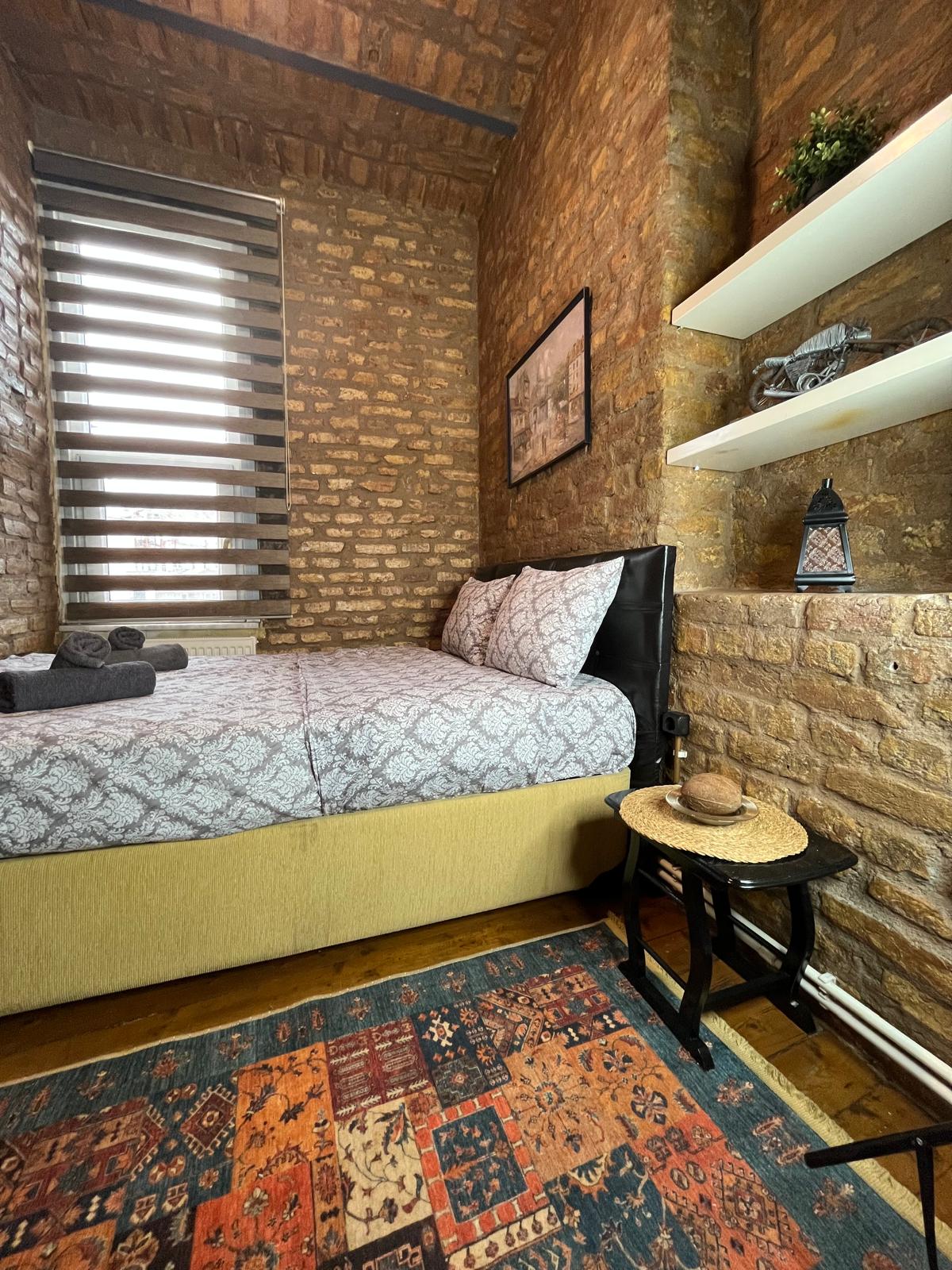 Nuestra suite, ubicada en los pisos -1 y -2 de nuestro edificio, ofrece una experiencia de alojamiento cómoda con su diseño elegante. La habitación tiene TV con acceso a Netflix, cocina y una elegante separación entre la cama y la sala de estar. La televisión giratoria se puede ver cómodamente desde cualquier ángulo. Nuestro edificio está ubicado en el centro, cerca de la estación de metro y a poca distancia del transporte. Hay una pequeña ventana en la habitación para la ventilación.