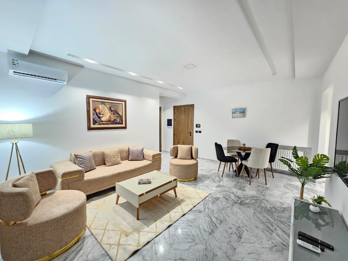 😊 Bienvenido a su hogar lejos de casa en Aouina. 🌟Luminoso, moderno y cómodo, es la opción ideal para disfrutar de Túnez con estilo, sin pasarse del presupuesto. 📍A solo: 8 minutos de La Marsa, 7 minutos del aeropuerto Cerca de tiendas y restaurantes Los ➕ : Aparcamiento privado en el sótano. Edificio seguro con vigilante las 24 horas. Wifi, aire acondicionado, cocina equipada. ¡Deja las maletas y sal a explorar! 🇹🇳 Perfecto para un viaje relajante por la ciudad o una estancia profesional con estilo 💖