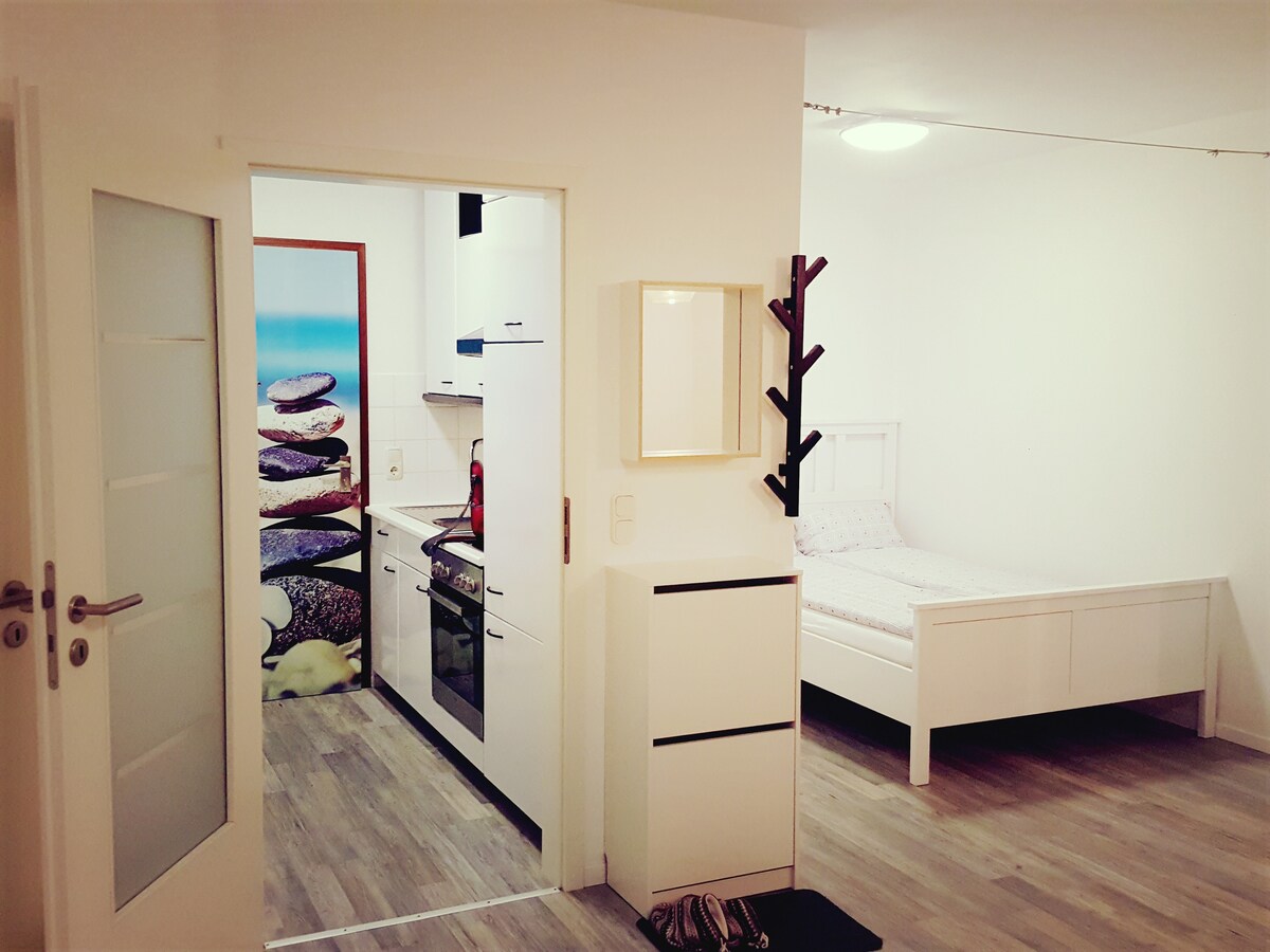 Apartamento estudio moderno, recién renovado, tranquilo y totalmente equipado en una ubicación muy buena. Además, ofrezco dos bicicletas que puedes utilizarlas de forma gratuita. El baño es grande y la cocina pequeña está separada de la zona para dormir. A pie, está a solo unos 15 minutos del casco antiguo, puedes caminar relajado a lo largo del río. Hay espacio de estacionamiento gratuito disponible. En la pequeña cocina totalmente equipada, hay dos platos, así como un microondas con función para hornear.