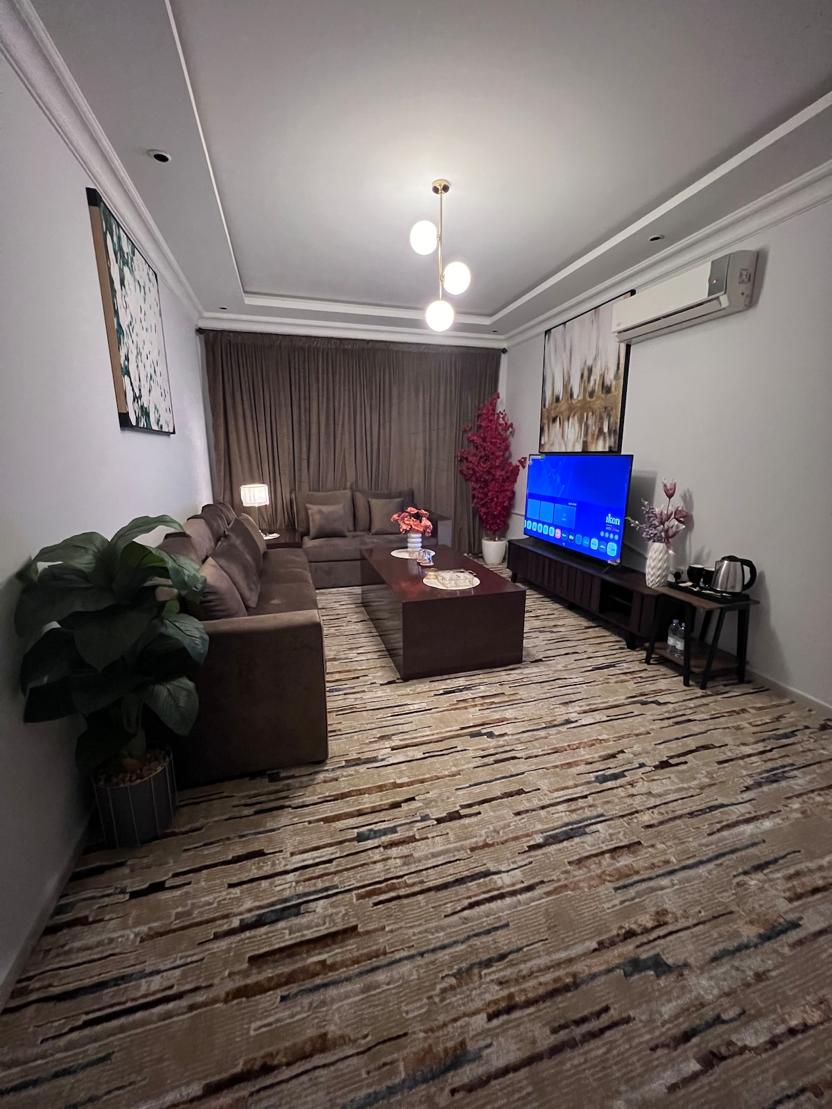 Disfruta de una experiencia única en una habitación privada que ofrece relax y comodidad. El apartamento incluye una cama y una sala de estar donde puedes disfrutar viendo una pantalla inteligente de 65 pulgadas. También hay una cocina separada y café para satisfacer todas tus necesidades. Dormitorio y salón del hotel con entrada inteligente y diseño cómodo A 5 minutos a pie del centro comercial Al-Ahsa A 5 minutos a pie del parque Rey Abdullah A 10 minutos en coche de la Universidad Rey Faisal A 10 minutos en coche de la Facultad de Letras A 10 minutos en coche del Aeropuerto Internacional de Al-Ahsa A 15 minutos en coche de la estación de tren Las cafeterías están cerca de los restaurantes