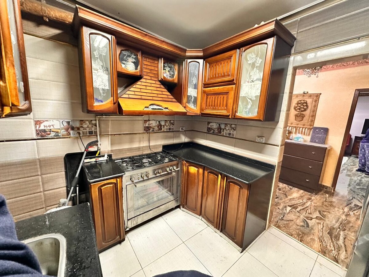 A 5 minutos del aeropuerto internacional Cairo. Un apartamento de 120 metros con 2 dormitorios que incluyen 2 camas cada uno (1 cama tamaño king y 3 camas medianas) , 1 baño y cocina con 2 neveras y lavavajillas. Incluye ascensor. Dos televisores con receptor, lavadora (ropa), 2 aspiradoras, calentador de agua, escalera portátil, 2 ventiladores y 2 líneas fijas.