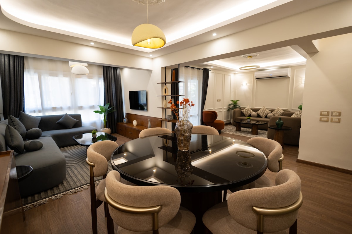 أهلاً بكم في الحي التاسع بفندق أوبروي! شقة فاخرة بغرفتي نوم (غرفتا نوم، ريسبشن، حمامان) تُطل على المساحات الخضراء والشارع الرئيسي. أثاث فندقي فاخر ووسائل راحة عصرية. - مطبخ مجهز بالكامل - جهازا تلفزيون ذكيان - واي فاي مجاني قربها من جولف سيتي مول (10 دقائق)، ومطار القاهرة (25 دقيقة)، والمتحف المصري (52 دقيقة). تتوفر خدمة النقل من وإلى المطار (بتكلفة إضافية). كما تتوفر خدمات تصفيف الشعر والمكياج من خبيرة محترفة (بتكلفة إضافية). تبعد عن مركز طبي متكامل 3 دقائق مشي على الاقدام