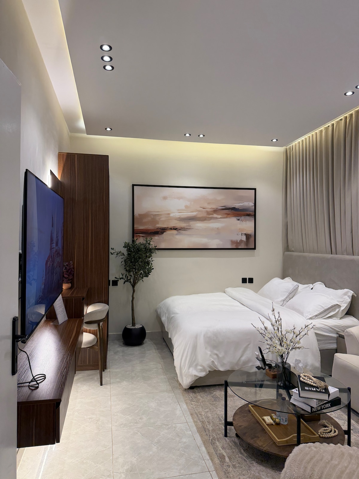 Luxury Penthouse with Self Entry consisting of two bedrooms, a living room, a cinema, outdoor seating area, and a two bathrooms fully equipped with shampoo, slippers, towels and tissues. •Located in Rasf Compound – Qurtubah District The living room TV and the cinema projector both provide access to all major platforms (Netflix, YouTube, and more). The property is in a strategic location close to: •Roshn Front (Riyadh Front) – 6 minutes •King Khalid International Airport – 15 minutes