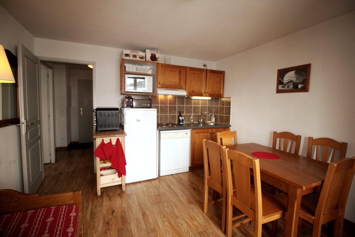Este bonito apartamento de 4/5 p en una cabaña privada tiene una ubicación ideal a 100 metros del pueblo. El acceso a las pistas está cerca y se puede llegar al chalet en esquí. Consta de: una entrada con armario de almacenamiento; un dormitorio con 3 camas supletorias, una sala de estar con cocina equipada, nevera, horno, sofá cama para 2 personas; un cuarto de baño con ducha, inodoro, lavadora. Nota: No se proporcionan fundas de edredón / toallas. Un casillero de esquí está disponible en la entrada del apartamento.