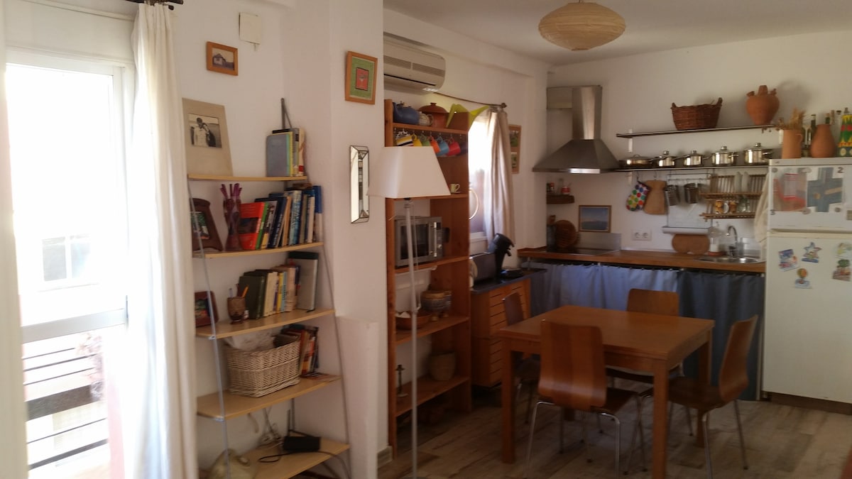 Estudio reformado junto al río Guadalquivir. Aire acondicionado split (frío/calor), amplia terraza con zona chill out, cama "queen" visco (150x190), wifi 600MB, Smart TV, área de teletrabajo, cocina totalmente equipada y baño con bañera! Muy luminoso y tranquilo (en una comunidad residencial), excelentemente comunicado (metro/bus/carril bici). Sólo a 10 MINUTOS A PIE del casco histórico, en el barrio más famoso de Sevilla, con amplia oferta de tiendas y restaurantes. Licencia: VUT/SE/06907