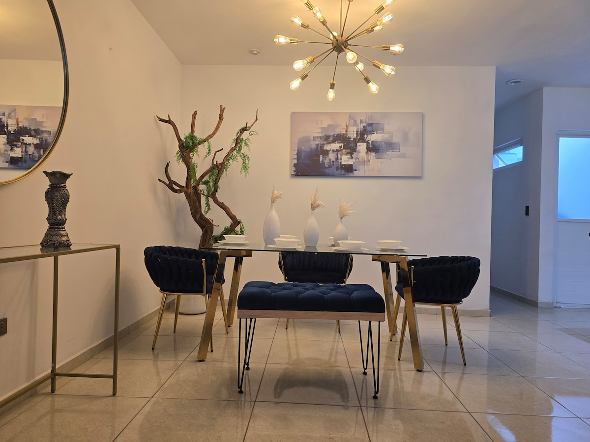 Acogedor y moderno Apartamento, con acceso controlado y vigilancia las 24 hrs. Zona segura. Tenemos excelente ubicación! a sólo 8 minutos del centro comercial Altaria, y 15 minutos de la feria Nacional de San Marcos. Contamos con 4 habitaciones y 3 baños completos, 5 camas y 2 sofas. Smart Tv & Wifi, closets y ganchos a su disposición. Un lugar perfecto para relajarse y pasar una excelente estancia en la ciudad de Aguascalientes.