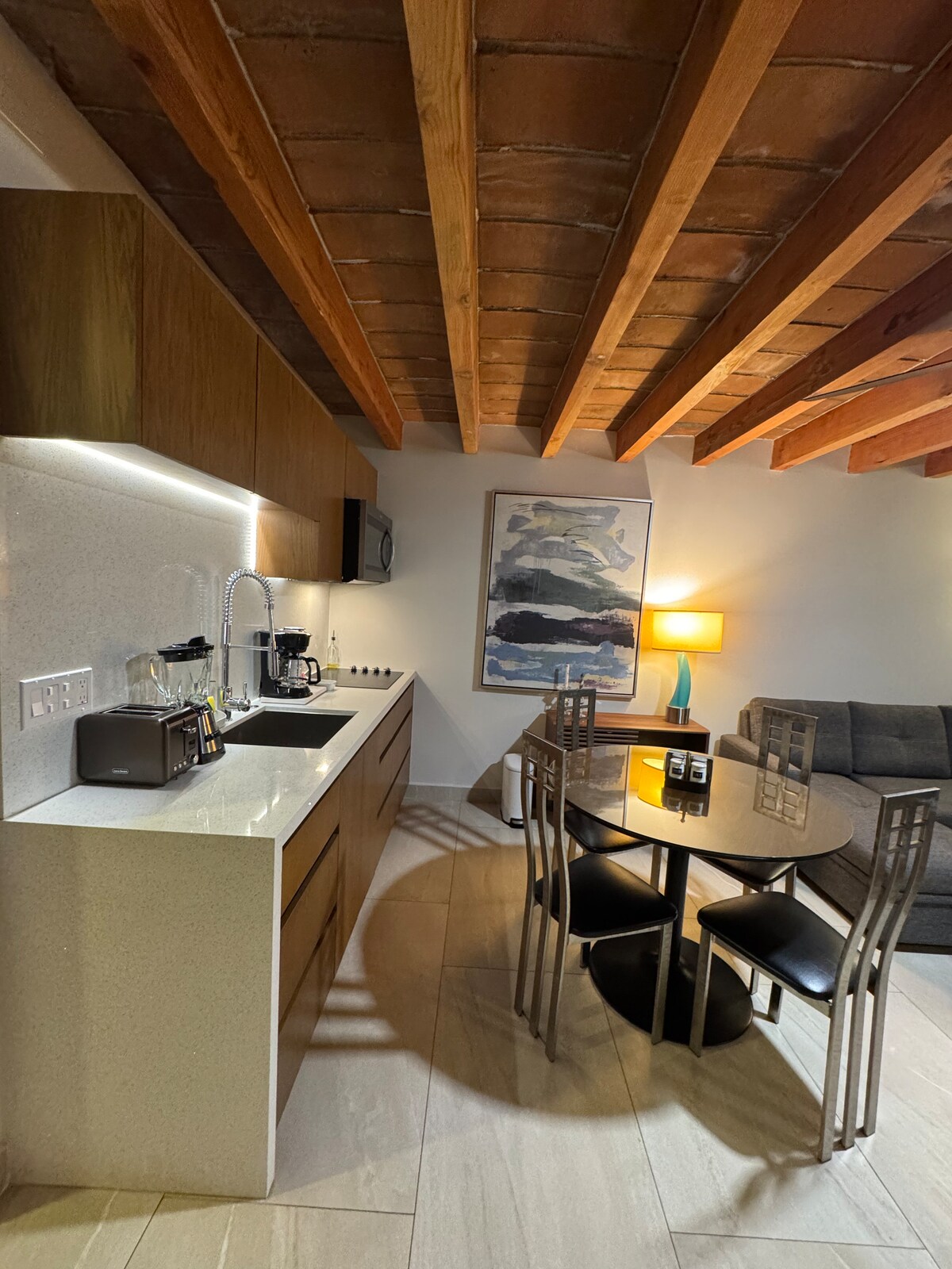 Departamento Wabi-sabi, filosofía japonesa que encuentra la belleza en las imperfecciones de la vida. Cuenta con 1 recamara (cama king), 1 baño completo, terraza, sala, comedor, 100% instalaciones eléctricas, centro de lavado, cafetera Nespresso, cocina habilitada con microondas, lava trastes, estufa eléctrica y utensilios para ser creativo en la cocina, TV 65" con suscripciones a plataformas, juegos de mesa, guías de turismo de la región, sillas, toallas y sombrillas para ir a la playa.