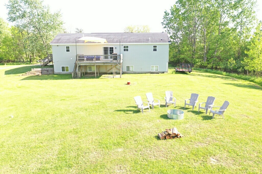 Two King beds and a bunk bed! Enjoy a couples or family get away with loved ones at this serene lakeside retreat. This 3-bedroom, 1.5-bathroom haven boasts modern comforts, a shared dock across the street and complimentary kayaks for endless lake adventures. Enjoy family meals on the spacious covered deck, soak in sunset views over Hutchins Lake, and toast marshmallows around the fire pit in the fenced backyard. With a peaceful dead-end street location, it's the perfect escape.