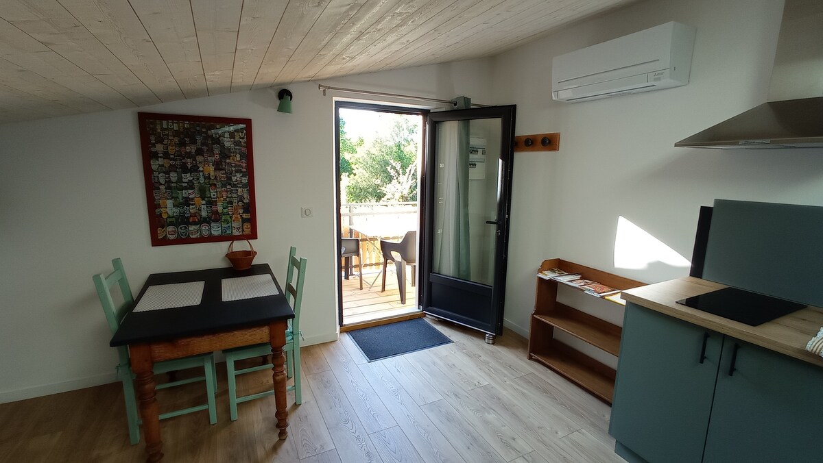 Situado en la Drôme, el estudio es independiente, en la planta baja de una casa de piedra, frente a un jardín de flores y árboles. Luminoso por la tarde, fresco en verano, está totalmente equipado con cocina americana y barra americana. El baño tiene una ducha a ras de suelo, un lavabo y un inodoro clásico. Hay dos camas disponibles: una cama en el dormitorio de 120x200 cm y un sofá cama de 140x200 cm en la habitación principal.