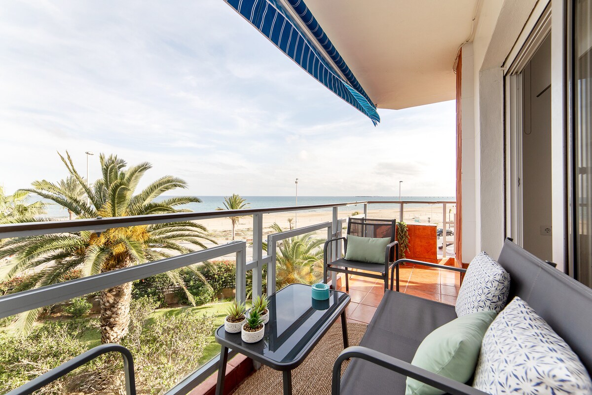 Casa frente al mar con piscina privada con vistas al mar. Situado en una playa con agua de calidad de bandera azul. Apartamento con porche, tres dormitorios, tres baños, tres terrazas. Habitación de matrimonio con terraza con vistas al mar. Cama de matrimonio, cuatro camas individuales. Porche con mesa para comer al aire libre con sofá y sillas. Perfecto para nómadas digitales. Disfruta de la brisa marina en la terraza comiendo una paella valenciana.