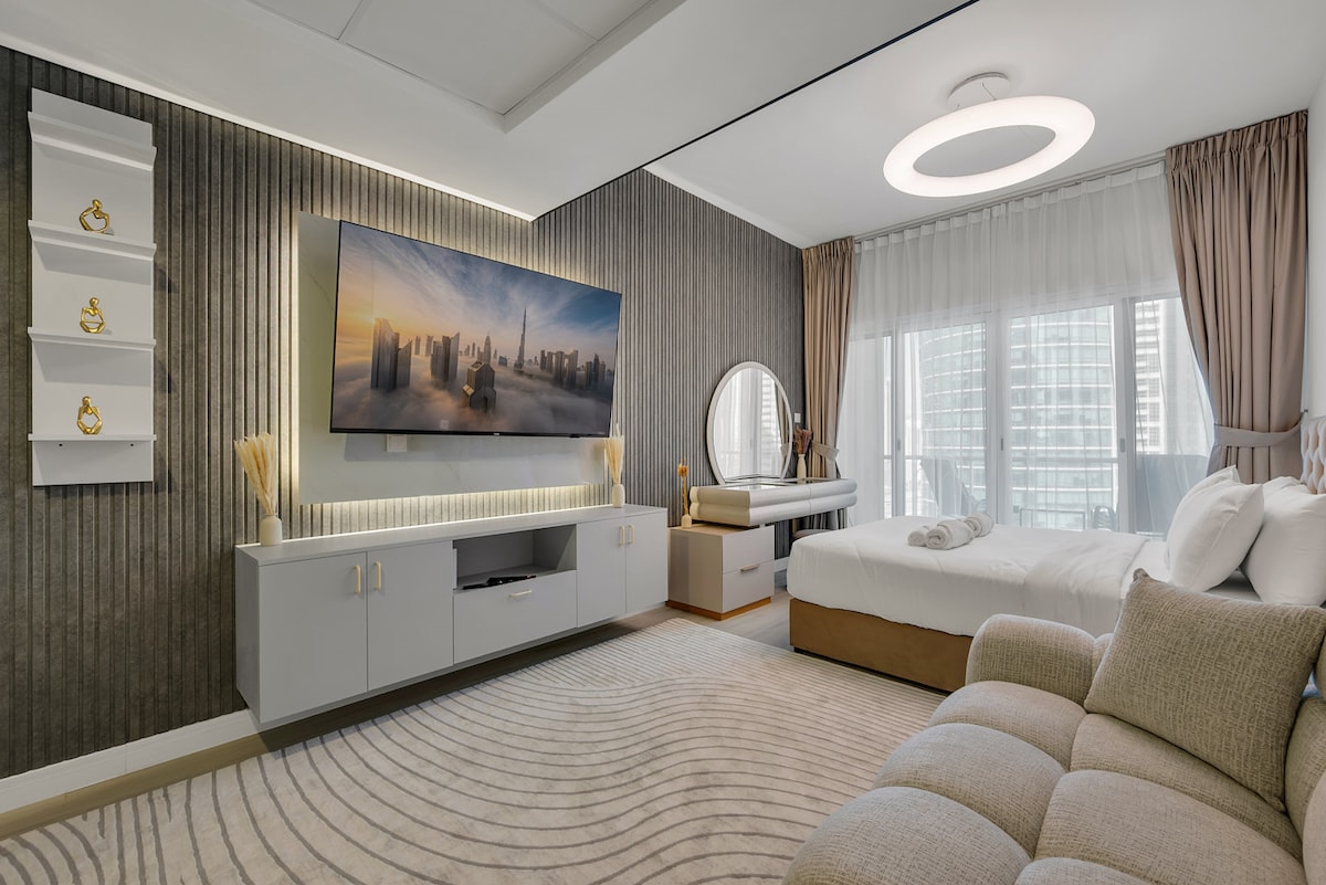 Descubre el lujo de nuestro apartamento 1BR en Jumeirah Lake Towers, Dubái, que ofrece una mezcla perfecta de comodidad y estilo. Este departamento cuenta con una habitación espaciosa con baño privado, un baño de invitados adicional y una cocina totalmente equipada. Disfruta de la moderna sala de estar de concepto abierto, ideal para relajarse y entretenerse. El balcón ofrece impresionantes vistas, perfecta para relajarse. Con wifi de alta velocidad y televisores inteligentes, este departamento combina comodidades modernas con el encanto de la vida en Dubái.