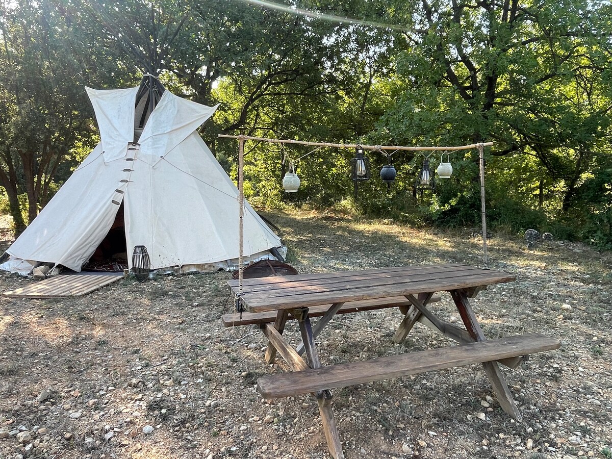 Bienvenido al Domaine de Céres, un remanso de paz ubicado en el corazón del bosque, donde puede relajarse y reconectarse con la naturaleza. A solo minutos del lago de Esparron de Verdon. El tipi Robinson está equipado con electricidad e iluminación led para una estadía cómoda. La cama de 140 está equipada con dos edredones para mayor calidez y comodidad El jacuzzi está abierto de mayo a septiembre, se privatiza en el lugar por 10 euros por treinta minutos