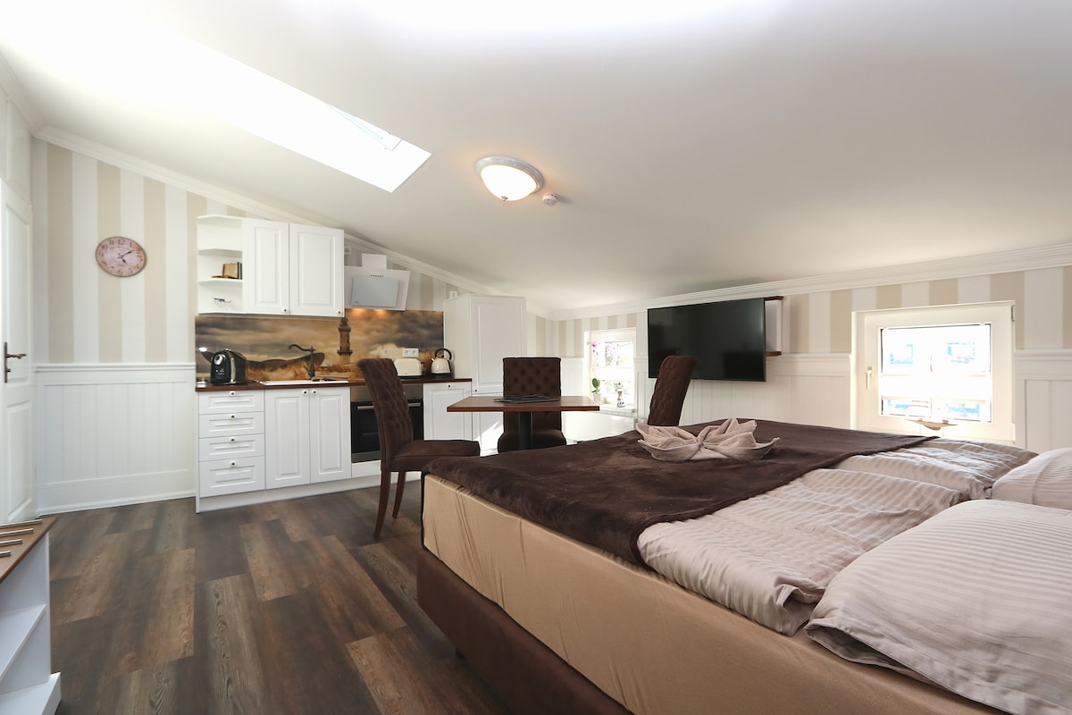 ¡Apartamento pequeño, acogedor, práctico y perfectamente situado en Warnemünde! Inundado de luz, en el ático, espera a los amigos del mar Báltico, que está a solo 70 m de distancia, pero a solo 4 minutos de la plaza de la iglesia, el corazón de Warnemünde. Dado que el sofá también está disponible como lugar para dormir, hasta 4 personas pueden alojarse allí, pero es óptimo para 2 personas. Para los niños, me complace proporcionar una cama y una silla a petición. ¡Los perros siempre son bienvenidos en mi casa!