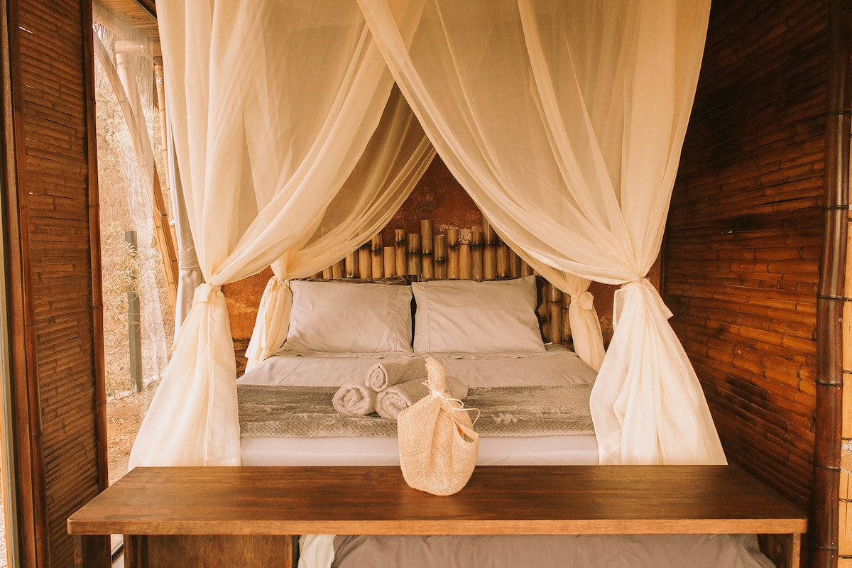 Hermosa casa con arquitectura ecológica en bambú y adobe. Para aquellos a los que les gusta estar en contacto con la naturaleza, sobrevolado por guacamayos y tucanes, con una hermosa vista del amanecer y la luna reflejada en las montañas. • Perfecto para 2 personas, 1 dormitorio con cama doble y 1 sofá cama en el entrepiso; • Smart TV en la habitación. • Alexa • Bañera de inmersión al aire libre • 1,2 km del centro de Alto Paraíso; • desayuno opcional • Excelente ubicación para los amantes de la tranquilidad, al mismo tiempo cerca del centro