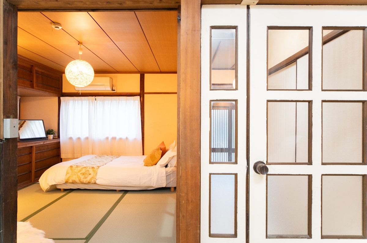 Renovated by your host - a woodworker and designer residing in Osaka - Traditional shikui plaster walls, exposed beams, cypress floors, shoji paper screens, a morutaru bathroom, horigotatsu table, and a hidden ninja door… Featuring a queen bed in the master bedroom, and 5 futon setups for the tatami room and the loft. 2 stations within 5-10 mins walk allow direct access to Umeda / Osaka station (4 mins), and Namba (9 mins)