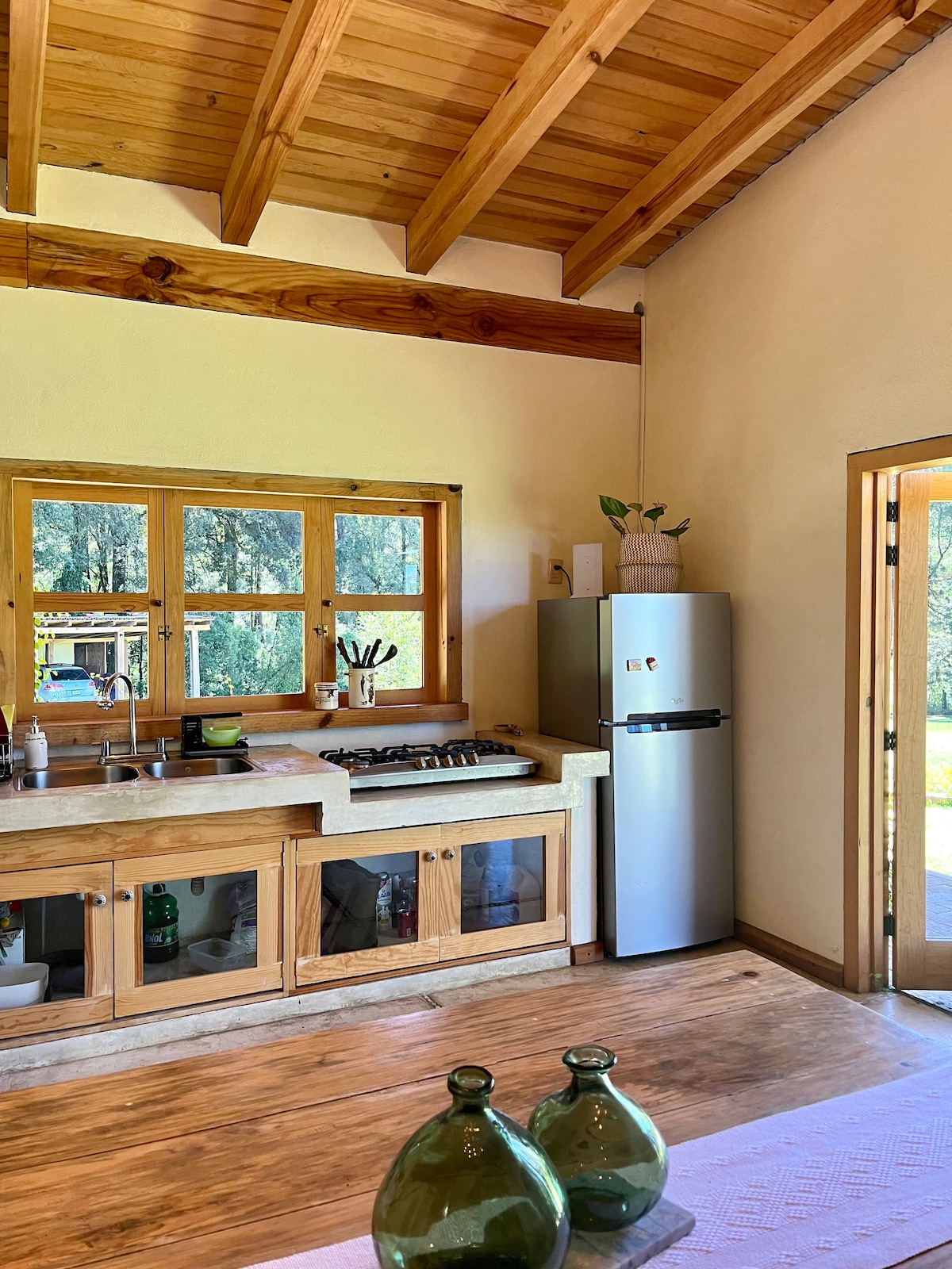 Casa armada con dos contenedores marítimos, diseñada con estilo contemporáneo y grandes ventanales para tener una experiencia en medio de un hermoso bosque de encinos y pinos propios de la zona. Ideal para desconectar de la ciudad, descansar, cocinar rico, pasar tiempo en familia y disfrutar noches de naturaleza. Este lugar es ideal si te gusta la naturaleza y la tranquilidad. No es ideal si buscas acceso súper fácil, llegar muy tarde o cero variaciones de servicios (como en ciudad).