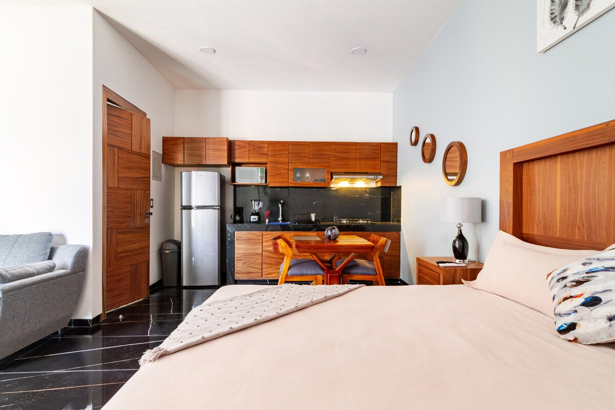 Estudio 51 es el espacio ideal para hospedarte en El Arenal “Patrimonio de la Humanidad” por su Paisaje azul, la tierra del tequila. Ubicado estratégicamente y con entrada independiente, amplias calles que permiten estacionarte sin complicaciones. Cuenta con sanitario y regadera separados para maximizar su uso, 1 cama queen, 1 sofá cama, closet con maletero, cocineta equipada, Smart tv, comedor con juego de ajedrez, bibliografía local, exposición pictórica y siempre con buen café.