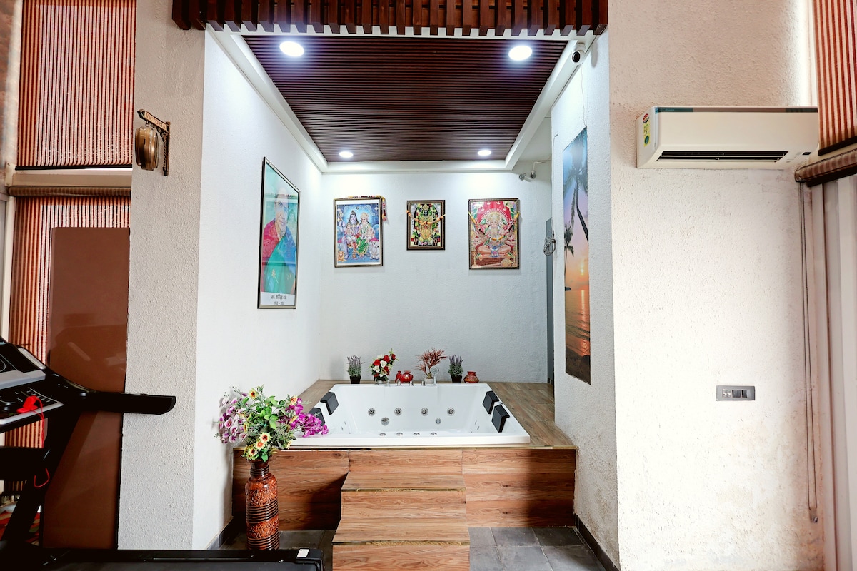 Luxe Heaven Heights 12th Patio 2 destaca por su jacuzzi privado de 2 plazas, sus impresionantes vistas a la ciudad y su moderna arquitectura. El gran espejo de pared añade elegancia, mientras que el baño tipo spa garantiza el lujo. Los huéspedes disfrutan de piscina, gimnasio, wifi de alta velocidad, TV de pantalla grande y seguridad y estacionamiento las 24 horas, los 7 días de la semana. La cocina totalmente equipada facilita las comidas caseras. Ubicado en la zona principal de Gurgaon, es muy seguro para las mujeres y ofrece acceso privado exclusivo.