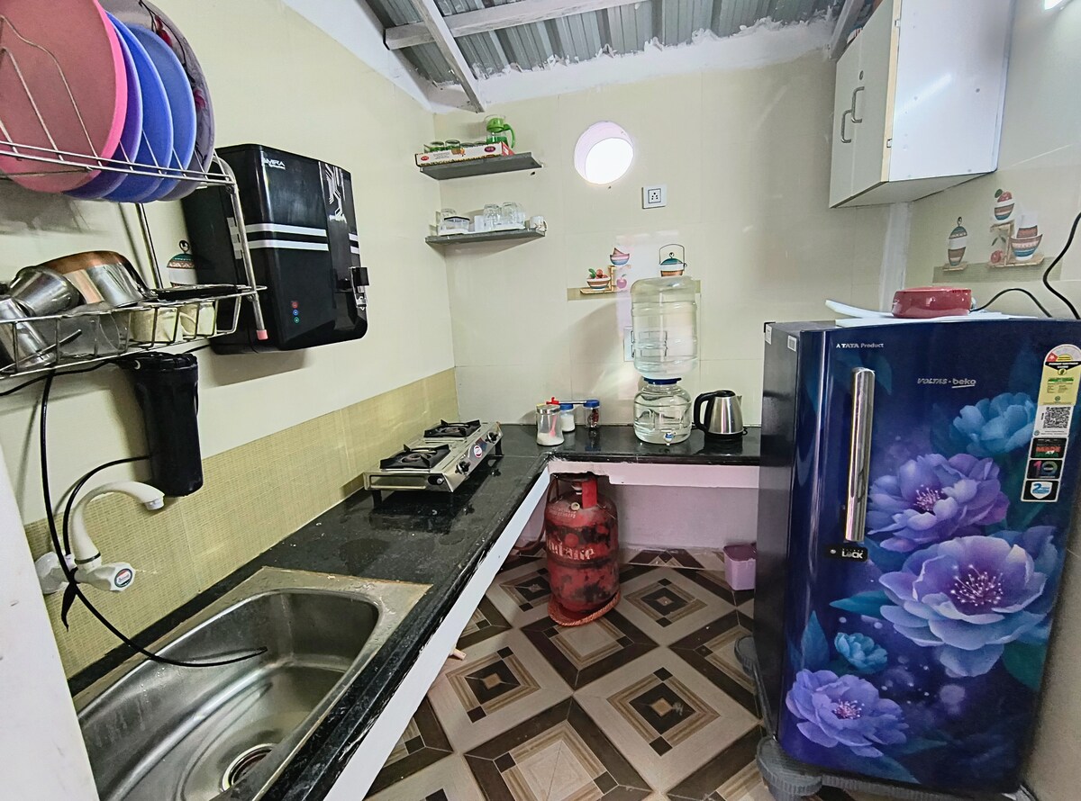 SUNDAR'S SANCTUARY - Your Great Escape to Paradise. Sun-Spangled, Inherently Peaceful and Close to nature . Only a 10 minute walk from the marketplace Parking for 2 cars in the premises. A small kitchenette equipped with: Refrigerator and gas stove Coffee maker with coffee, tea and sugar sachets. Non stick cookware and utensils for heating food and simple cooking like Maggi only Home delivery of food available. Dinein restaurants at walking distance Check in 12 noon to9pm Check out 10 am