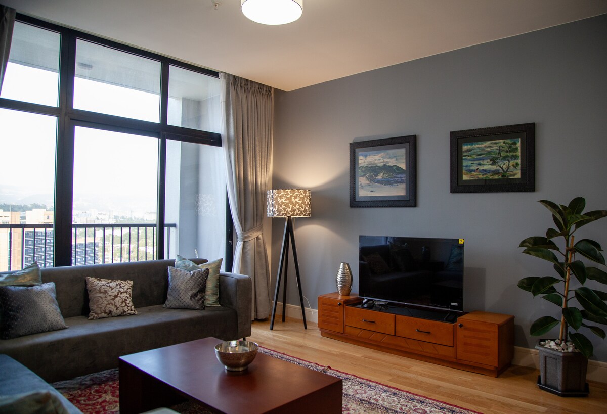 Lujoso apartamento en la zona de Hayahulet de Addis Abeba, con 2 dormitorios, 2 baños completos, cocina completa, bar, sala de estar con zona de trabajo, aparcamiento dedicado, wifi y generador de respaldo. Perfecto para viajeros de negocios o estancias prolongadas. A solo 10 minutos del aeropuerto y a 5 minutos de la estación de tren.
