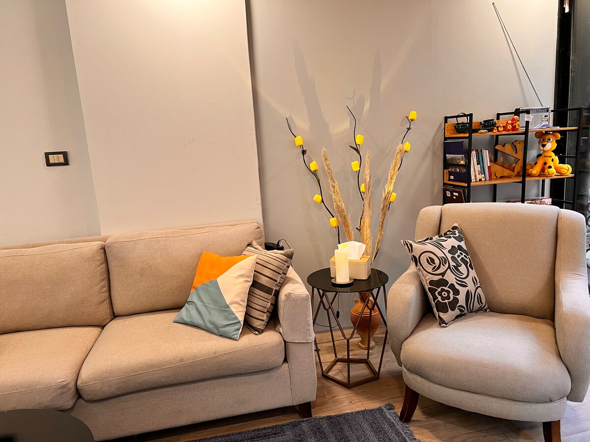 Un moderno apartamento de 100 metros cuadrados ubicado en el barrio más agradable y tranquilo en Ammán, este apartamento está diseñado cuidadosamente para adaptarse a los deseos, donde encuentras tu total comodidad durante una estancia larga y corta, el clima estás solo o con tu familia, y ya sea en unas vacaciones o en un viaje de negocios. Cuando planeas un viaje a Petra, Rum, Aqaba, Mar Muerto, y no quieres perder tiempo en el tráfico, esta aplicación sería tu mejor opción. El aire acondicionado solo está en las salas de estar, mientras que los dormitorios solo tienen ventiladores.