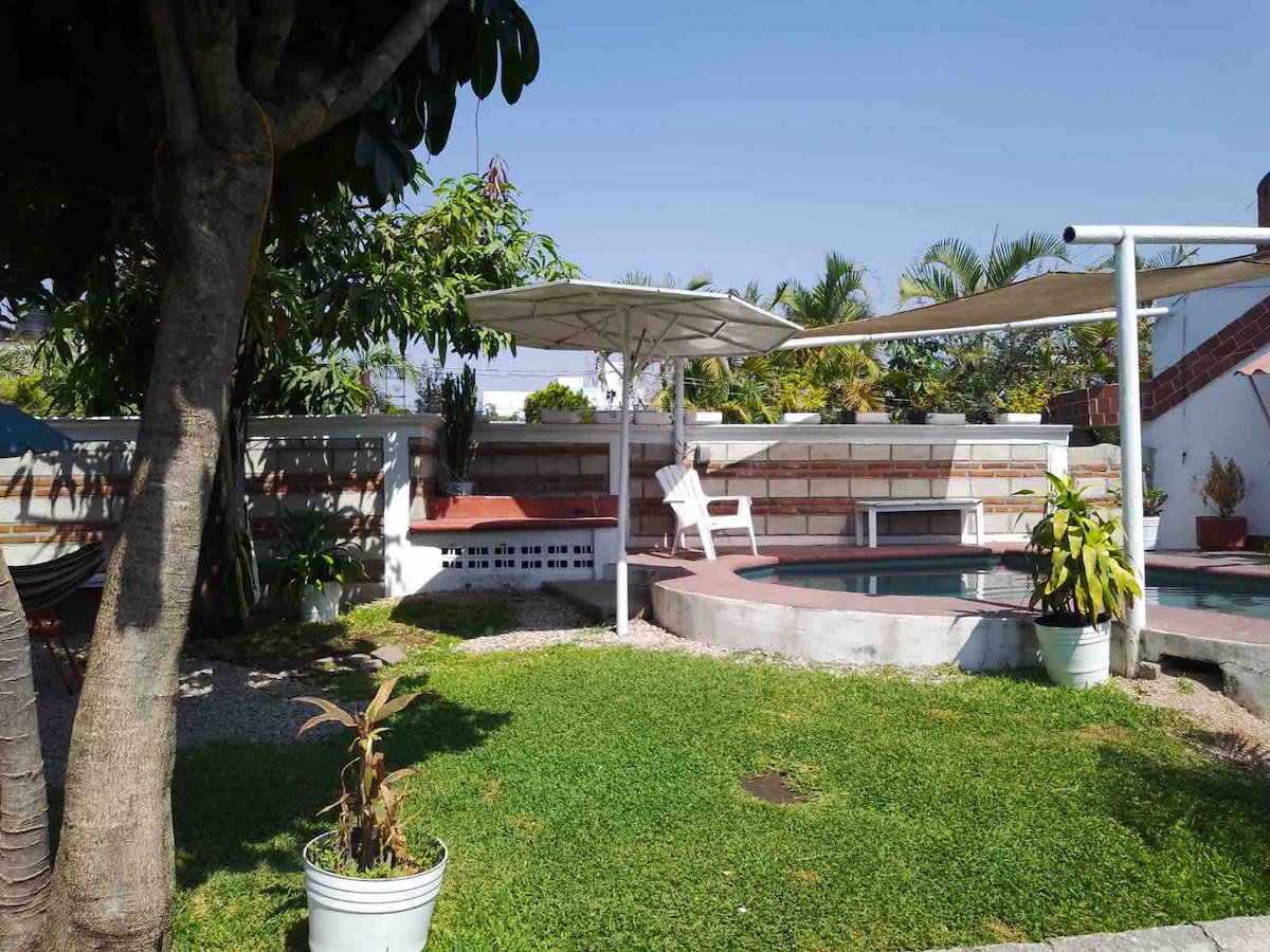 Casita de una planta, cómoda, segura y con cochera doble, podrán divertirse, hacer home office o descansar. Hay jardín con árboles y césped; una mini alberca sin caldera y jacuzzi con paneles solares. En la sala contarás con WIFI, Smart TV de 50", además de dos sofas/cama. Una cocina pequeña (con mini despensa) y 2 habitaciones con: una cama matrimonial, mosquitero, ventilador y baño completo cada una. Bienvenidos los perros (2 máx.) Indispensable incluirlos en su reservación y pagar $250 c/u.