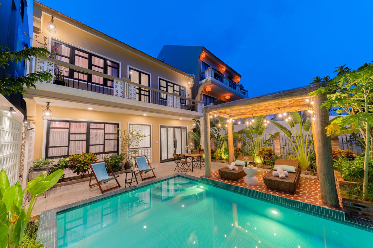 🎁 Una villa de nueva construcción a solo 3 minutos a pie de la playa de Cua Dai y el río Thu Bon, que ofrece una rara mezcla de privacidad, bienestar y encanto costero. Disfruta de una piscina privada, yoga en la playa y acceso a pie a restaurantes y spas locales. Con 3 dormitorios serenos (2 camas tamaño king + 2 individuales), alberga cómodamente a 6 adultos + 2 niños (menores de 6 años), perfecto para familias que buscan espacio, relajación y conexión significativa en un entorno refinado y tranquilo.