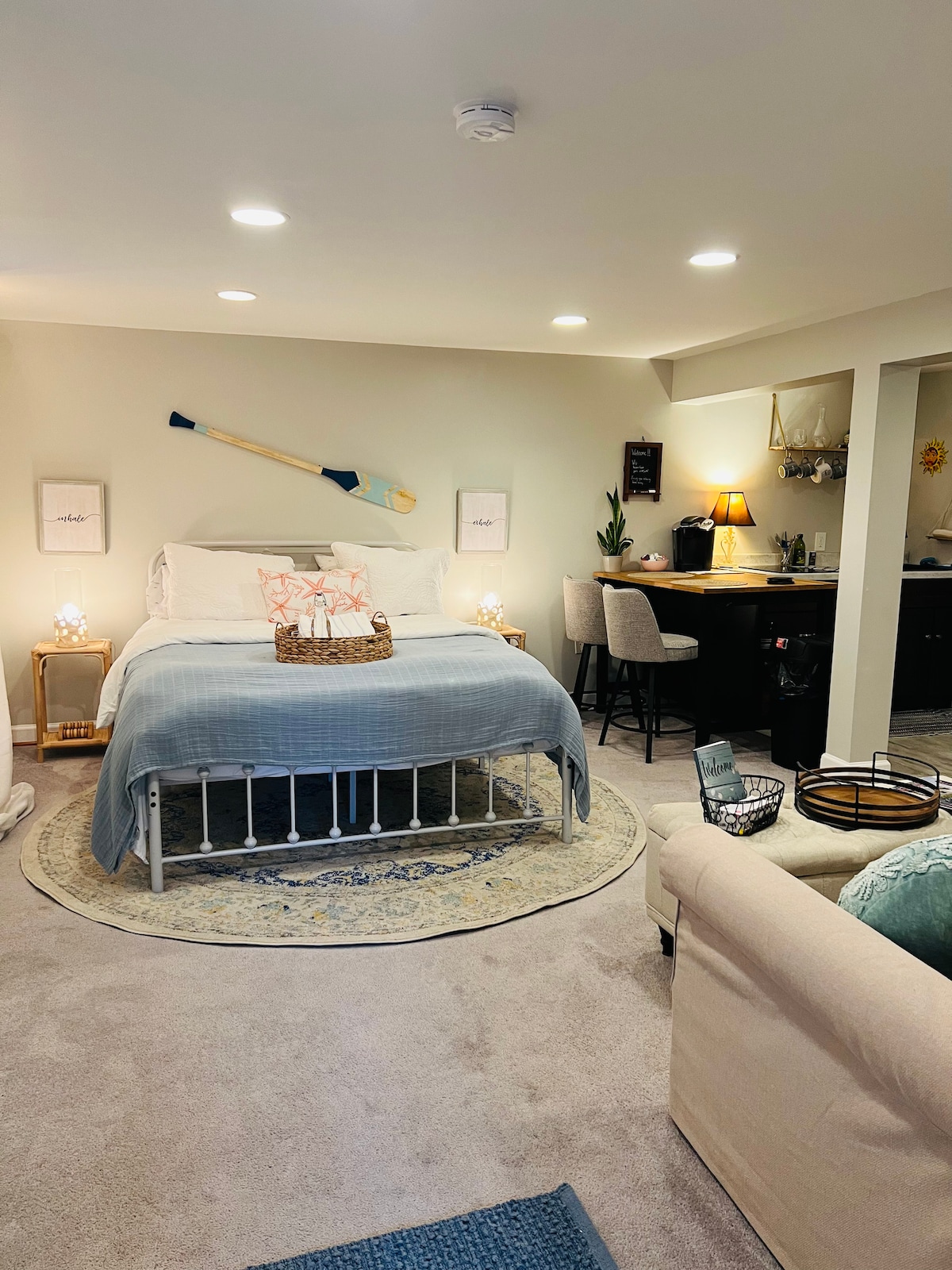 Relájate en esta tranquila y elegante suite a pocos minutos de BWI. Ubicada en el nivel inferior de una moderna casa adosada, cuenta con una entrada privada, un acogedor comedor, un amplio baño y un acogedor dormitorio con una cama tamaño queen nueva y un televisor de alta definición. Un espacio de estacionamiento bien iluminado agrega comodidad. La cocina incluye una mini nevera, freidora de aire, microondas, cafetera y elementos esenciales para una estancia relajante y cómoda, con fácil acceso a tiendas, restaurantes y las principales autopistas.