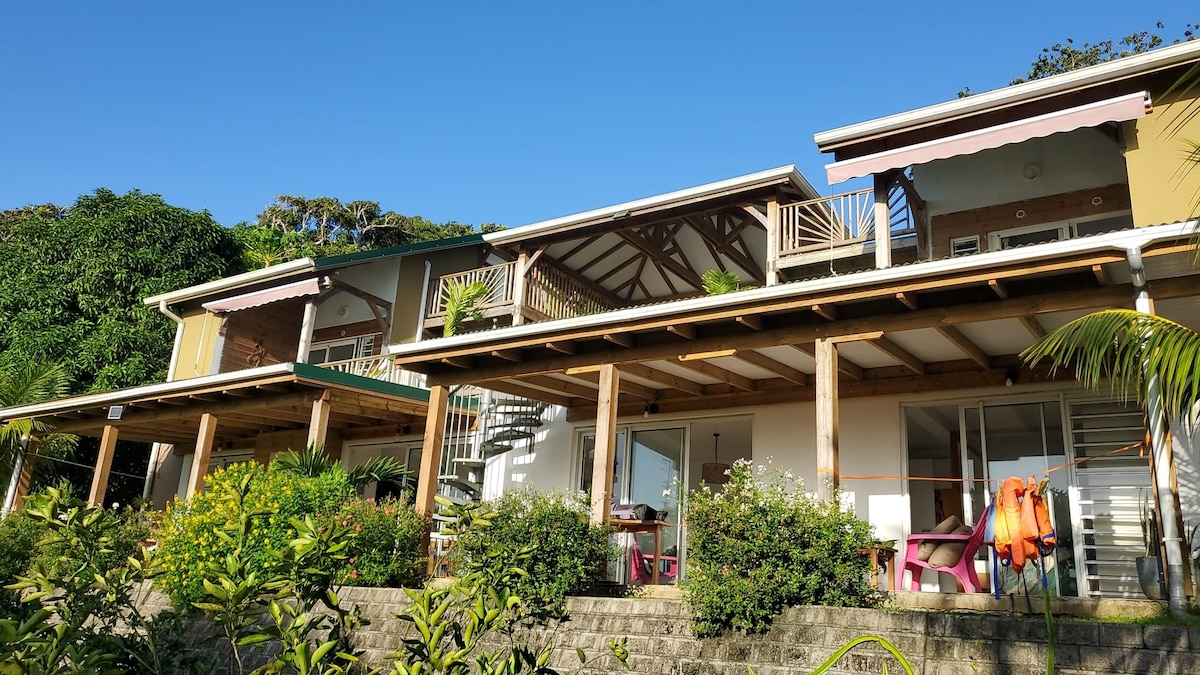 🐢 Bienvenue à la "Baie des Tortues" ! Ambiance vacances dans cet appartement de deux chambres vue mer, idéal pour nager avec les tortues à l'Anse Dufour et à l'Anse Noire, à 1 min à pieds. ⭐ Appartement neuf tout équipé, avec vue mer, aux Anses d'Arlet. Déco nature. 🌅 Inoubliables couchers de soleil sur la terrasse, avec le bruit des vagues. Et aussi : 😍 Vue mer panoramique ❄️ 2 chambres climatisées au calme 🍽️ Cuisine équipée, restaurants à proximité 🚗 Parking privé gratuit