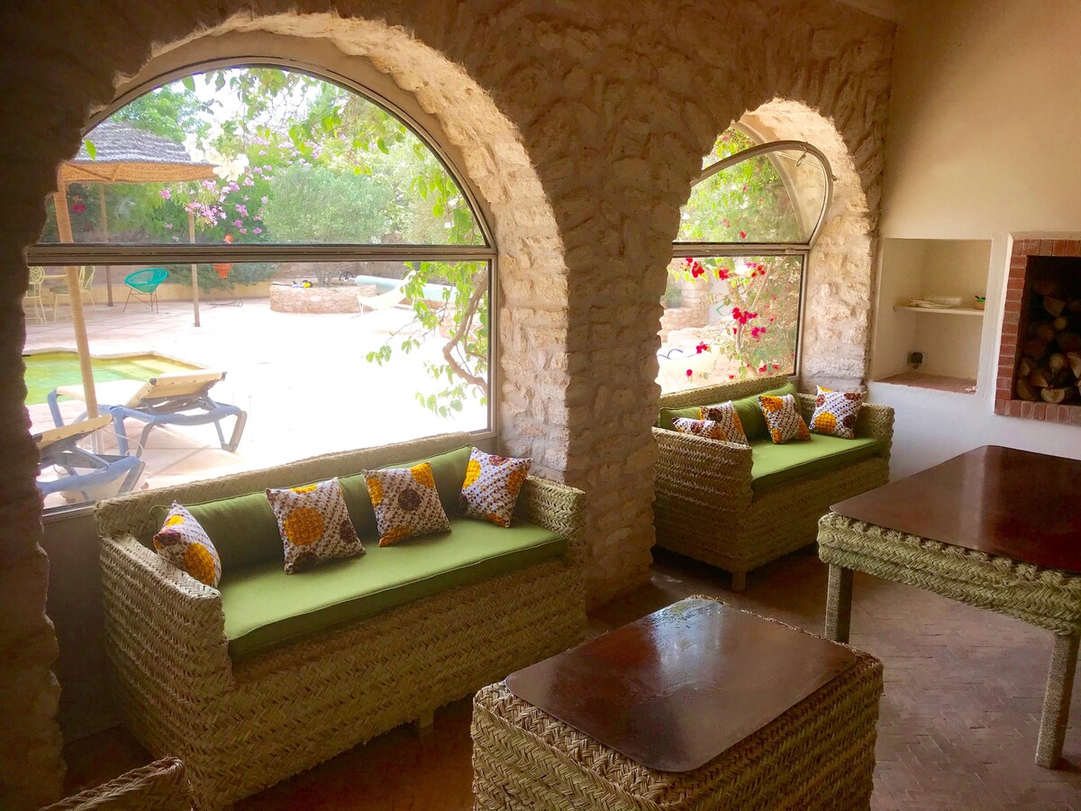 The "Douâr d'Ô" is a chic, detached, 250m² Beldi villa boasting a magnificent private emerald-green swimming pool and a lush, expansive garden, all set within 2,500m² of grounds. Two enclosures ensure peace and tranquility in this rural setting, just 200 meters from the dunes overlooking a forest of thuya, argan, and eucalyptus trees, and offering breathtaking views of the ocean and its jewel, Essaouira/Mogador. All comforts: Wi-Fi, satellite TV, air conditioning, service.