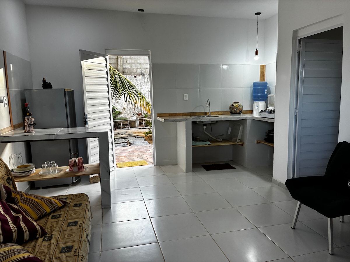 Apartamento en la planta baja de nuestra Posada Vila Beija-flor, para hasta 5 personas con cocina nueva y completa. Vistas para el mar y dunas. Cuarto con cama de matrimonio y otra de soltero y dos camas en la sala. TV plana 21", Netflix, ventiladores, caja de seguridad, ducha caliente, wi fi, hamaca en la terraza. Comedor frente al jardin con vistas hacia el mar.