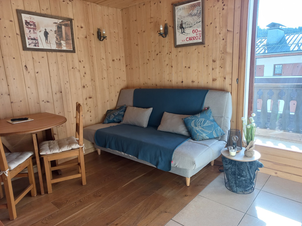 Studio entièrement rénové fin 2021/début 2022, ambiance cosy. Avec vue magnifique sur la chaîne des Aravis et sur les pistes de Skis du Crêt du Merle. Secteur village, au calme tout en étant à proximité des commerces. Vous pourrez admirer cette belle vue depuis le balcon exposé sud, ce studio de 20m2 peut accueillir 3 personnes. Studio très bien équipé et fonctionnel.