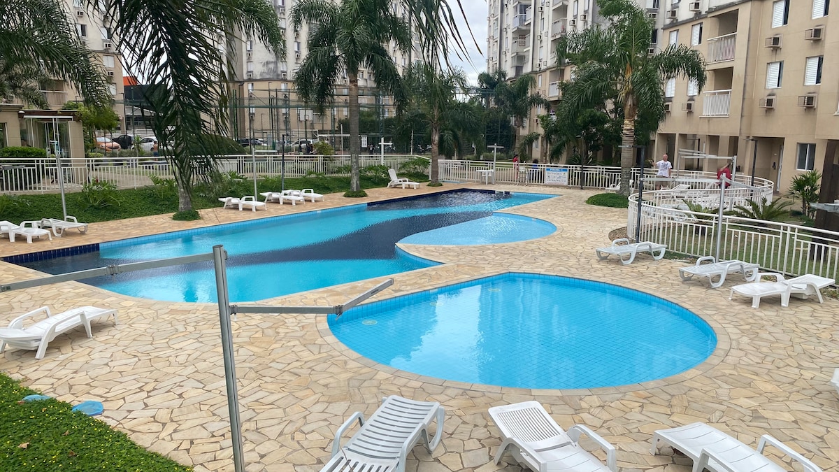 Departamento con garaje y aire acondicionado, con increíbles vistas desde el piso 21, estudio en un club de condominios de alta gama. Zonas comunes con piscina climatizada, gimnasio, coworking, sauna, lavandería, parque infantil y mercado autónomo. 4 personas (1 cama doble y 1 sofá cama), equipado con ropa de cama completa, ducha relajante, cocina planificada con varios electrodomésticos y utensilios, y moderno Smart TV que garantiza entretenimiento.
