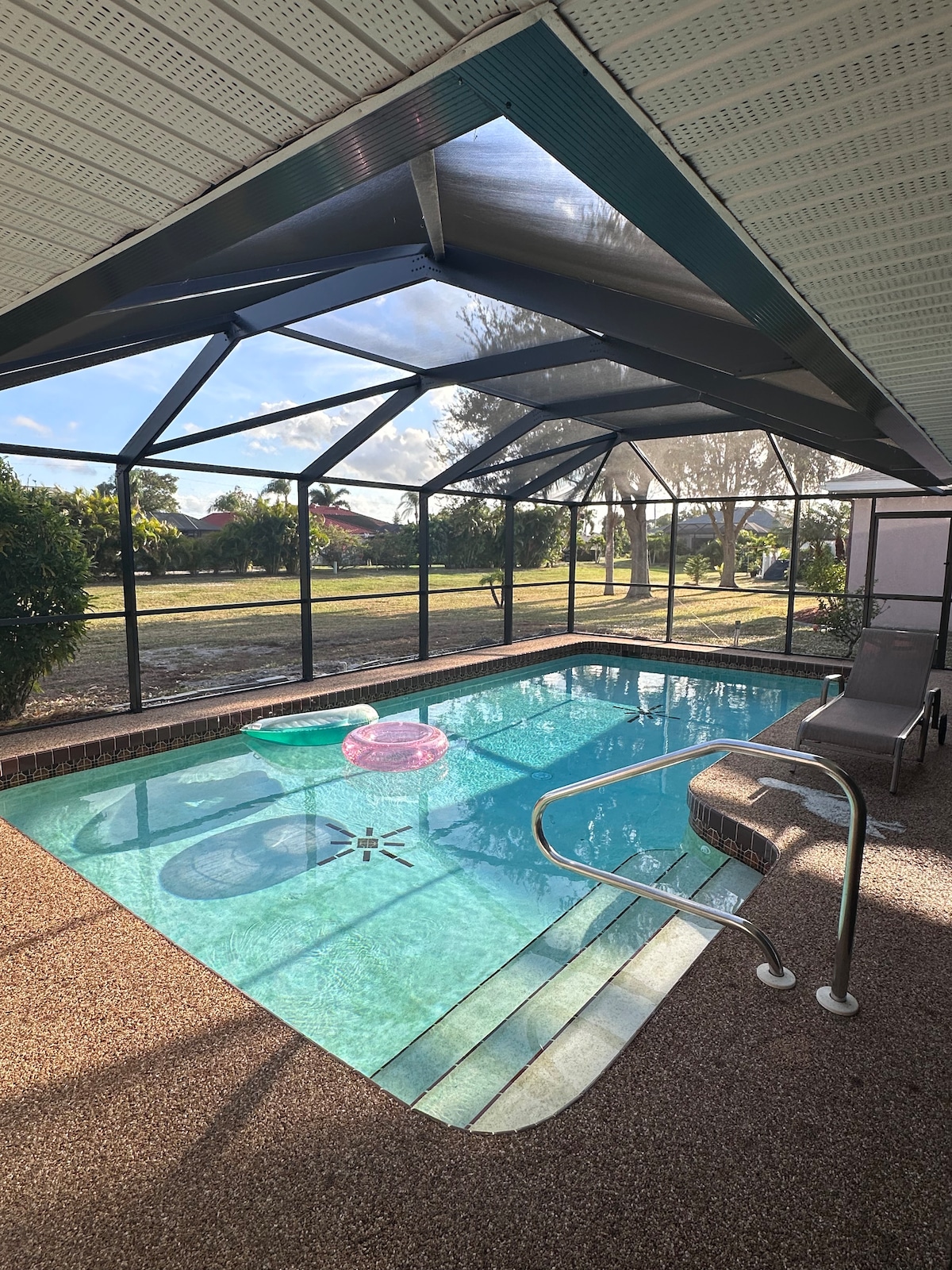 1) Hermosa casa de nueva construcción en 2 acres de 1800 pies cuadrados con 3 dormitorios y 2 baños con capacidad para 8 personas. 2) Tiene una gran piscina sobre el suelo de 18' x 33' y un gran estanque de peces y bar/barbacoa al aire libre y estacionamiento de paisaje tropical para 4 coches. 3) A 15 minutos en coche del centro de Punta Gorda con muchos restaurantes, pequeñas tiendas y bares con música en vivo y mucho más, a 7 minutos en coche de la tienda más cercana Winn-Dixie. 4) A 10 minutos en coche del aeropuerto de Punta Gorda. Situada en un barrio tranquilo con grandes robles en una calle sin salida.
