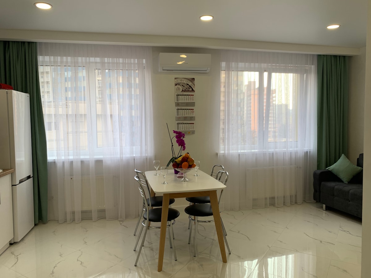 Te alojarás en un estudio totalmente equipado de 38 m2. En el quinto piso Cocina-estudio + baño Adecuado para 3 personas - 1 cama tamaño queen (160*200 cm) - 1 sofá cama A 10 minutos caminando del mar (Ibiza/Itaka). A 5 minutos a pie de la plaza Gagarin El centro comercial más cercano está justo enfrente (centro comercial Kadorr City). p/s Está estrictamente prohibido fumar dentro del apartamento