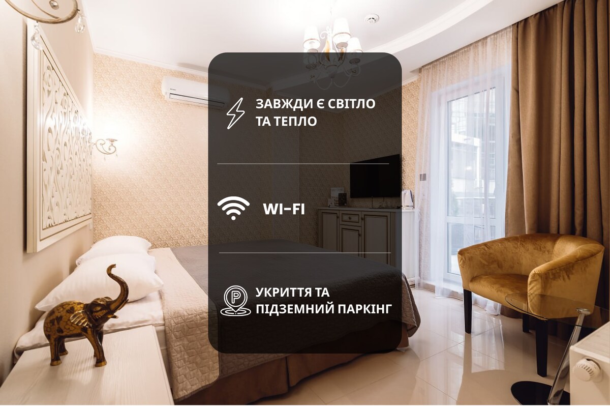 Насолоджуйтеся вдосконаленими номерами з чудовим видом і стильним інтер'єром, включаючи King-Size ліжко, м'який диван і затишний куточок для максимального комфорту та релаксації. Кожен з наших номерів має свою власну унікальну кольорову гаму. Для вибору ідеального варіанту телефонуйте нам.