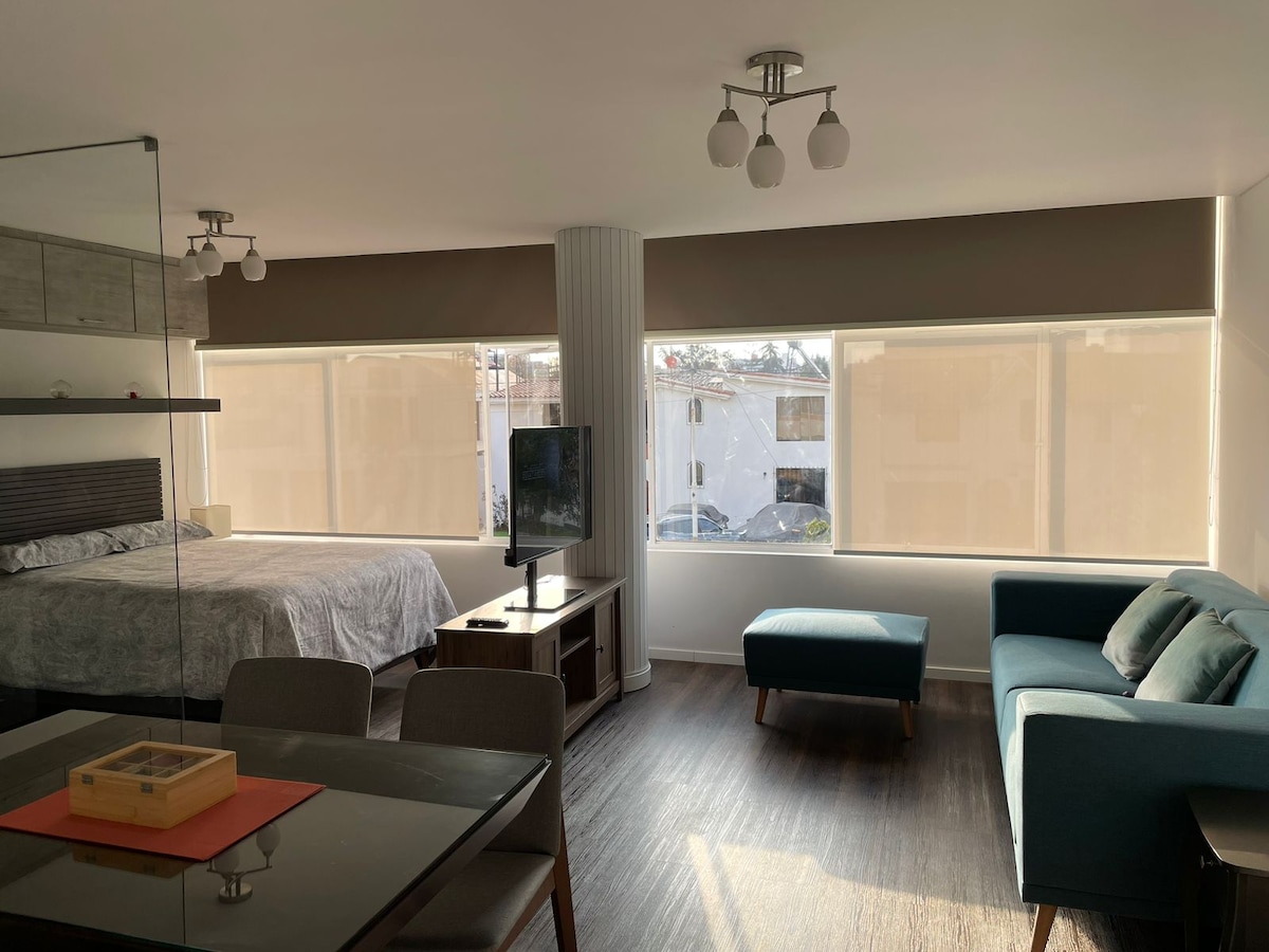 Disfruta de una experiencia con estilo en este alojamiento céntrico. Moderno estudio diseñado para ofrecer comodidad y estilo en un espacio compacto pero completamente funcional. Perfecto para viajeros de negocios, parejas o aquellos que buscan una escapada tranquila. Cuenta con Wi-Fi de alta velocidad, TV streaming (prime Netflix) toallas y ropa de cama incluidas, además de una cocina completamente equipada con todo lo necesario para preparar tus comidas. PH, jabón, champú cortesía.