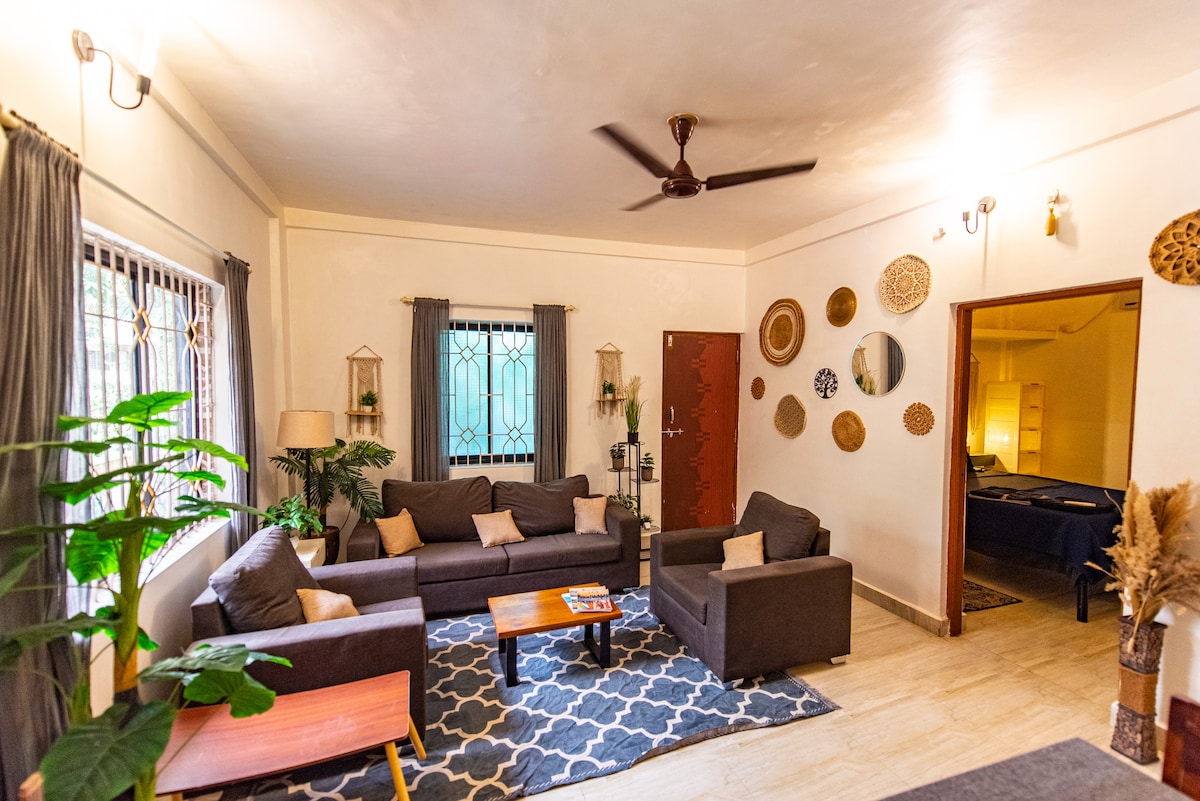 Sumérgete en nuestro encantador 1BHK, adornado con decoraciones de buen gusto y flanqueado por dos balcones que revelan vistas serenas al campo. La acogedora sala de estar está equipada con asientos para 4 personas y una mesa de comedor, perfecta para reuniones o cenas tranquilas. Nuestra cocina está totalmente equipada para atender tus aventuras culinarias. Mantente conectado con wifi de alta velocidad de 150 MB/s, complementado con respaldo de UPS para garantizar un servicio en línea ininterrumpido. Este espacio está diseñado para ofrecer todo lo necesario para una estancia inolvidable.
