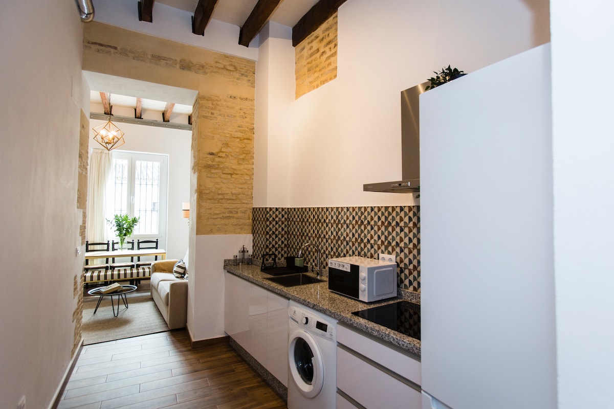 Lujoso Duplex con bañera, de 87 m2 con vistas a los jardines de la Casa Pilatos, uno de los monumentos más visitados de la ciudad de Sevilla. Totalmente nuevo, a estrenar, con una decoración exquisita y equipado con las mejores calidades en confort y equipamiento: 2 habitaciones con cama de matrimonio King Size, una de ellas en planta baja y la otra en planta alta con bañera en la propia habitación. Cocina con electrodomésticos y cafetera Nespresso, cuarto de baño completo con ducha cascada.
